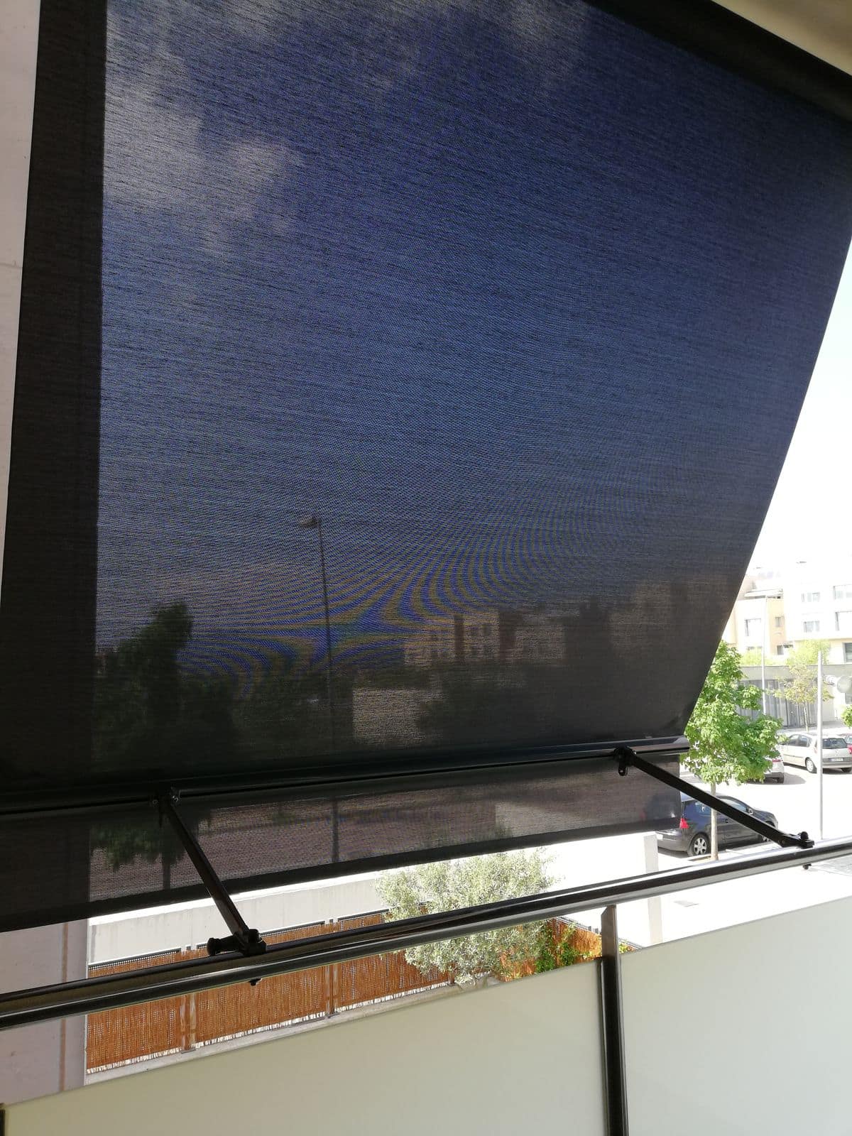2. Con el brazo recogido, enganchado directamente a la barandilla, tensando la lona y haciendo el efecto telón que ofrece gran resistencia al viento.