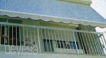 Es un toldo pensado principalmente para balcones. Se sujeta al techo y a la barandilla. Consta de unos brazos de 50 cm de largo fabricados en aluminio, situados en la barra de carga, y que se enganchan a la barandilla por medio de una pieza fijada a esta.