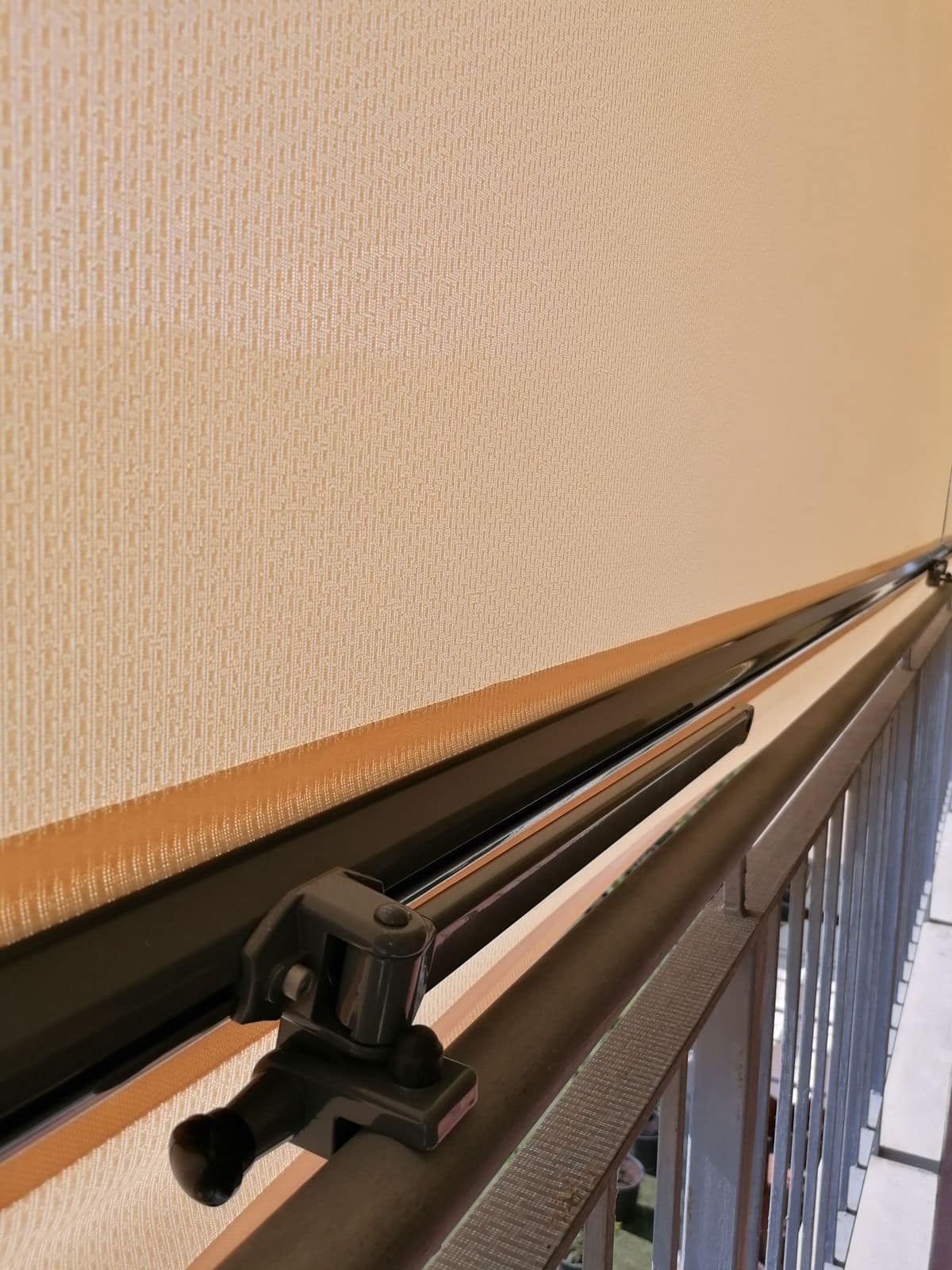 1. Con el brazo extendido, enganchándolos a la barandilla de forma que el toldo nos queda separado de esta, dejando pasar el aire para una mejor ventilación, a la vez que le protege del sol.